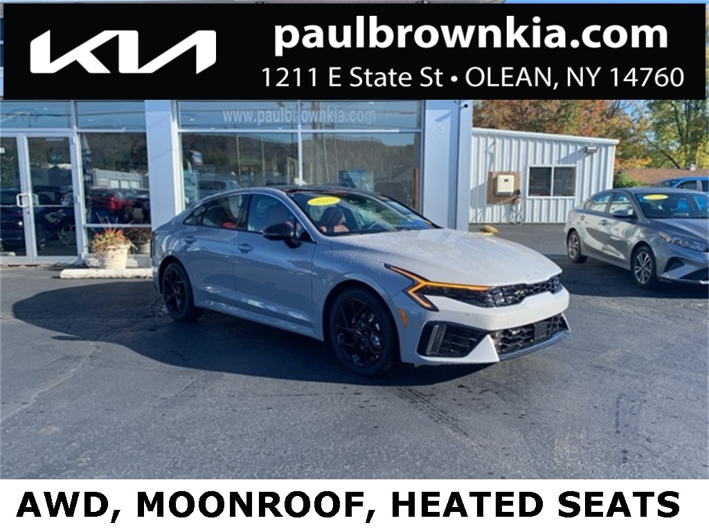 Our For The People Pricing means ZERO price increases at Paul Brown. $2,714 off MSRP! 2026 Kia K5 GT-Line 4D Sedan Wolf Gray I4 8-Speed Automatic AWD Auto High-beam Headlights, Emergency communication system: Kia Connect (includes 1 year free trial), Front dual zone A/C, Fully automatic headlights, Heated door mirrors, Heated front seats, Heated steering wheel, Low tire pressure warning, Panoramic Sunroof, Power door mirrors, Power driver seat, Rear window defroster, Remote keyless entry, Wheels: 18" x 7.5J Gloss Black Machined Finish Alloy. 24/33 City/Highway MPG Final Price may require vehicle trade in and Paul Brown trade assistance, see website for details. For a hassle free purchase experience, reach out to the Sales team at Paul Brown Chevy at (716) 244-6077. Conveniently located on Route 16 North, Olean NY 14760. We are worth the trip! Travel from over 75 miles away and don't purchase we will supply you with $25 gas card! Paul Brown Chevy, A Dealer For the People! Price includes: $1000 - KFA Dealer Choice Program: $1000 discount and 5.25% APR for 36 months. $30.08 per $1000 financed. Available to well qualified buyers who finance through Kia Finance America. 506. Exp. 12/01/2025
