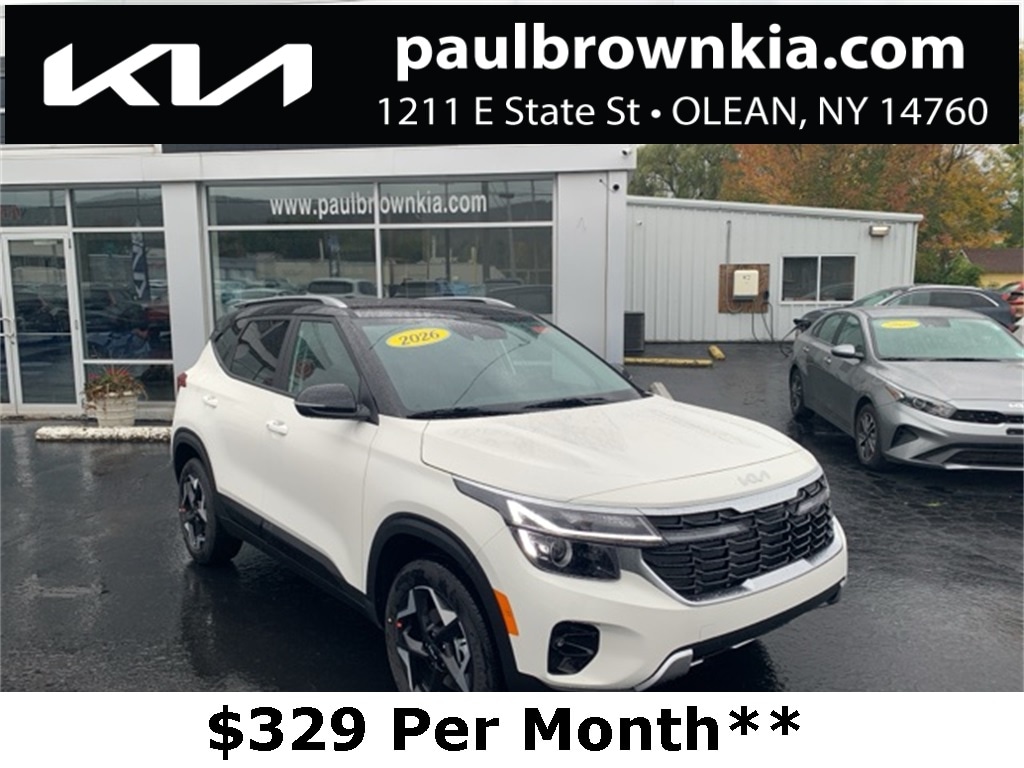 Our For The People Pricing means ZERO price increases at Paul Brown. New Price! $3,309 off MSRP! 2026 Kia Seltos S 4D Sport Utility Clear White/Black Roof 2.0L I4 MPI CVT AWD **$329 Per month 36 month lease 30,000 total miles at lease end. $3,0299 total down including first payment. NYS Tax and fees are included in the payment. Residency restrictions may apply. Must Qualify through KMF. No Security Deposit Required, Air Conditioning, Apple CarPlay & Android Auto, Automatic temperature control, Cloth & Artificial Leather Seat Trim, Emergency communication system: 911 Connect, Heated door mirrors, Heated Front Bucket Seats (3-Steps), Low tire pressure warning, Navigation System/GPS/Navi, Power door mirrors, Rear window defroster, Remote keyless entry, Wheels: 17" Alloy w/Machined Finish. 27/31 City/Highway MPG Final Price may require vehicle trade in and Paul Brown trade assistance, see website for details. For a hassle free purchase experience, reach out to the Sales team at Paul Brown Chevy at (716) 244-6077. Conveniently located on Route 16 North, Olean NY 14760. We are worth the trip! Travel from over 75 miles away and don't purchase we will supply you with $25 gas card! Paul Brown Chevy, A Dealer For the People! Price includes: $500 - KFA Dealer Choice Program: $500 discount and 5.25% APR for 36 months. $30.08 per $1000 financed. Available to well qualified buyers who finance through Kia Finance America. 506. Exp. 01/02/2026 $500 - Sticker Sales Event Retail Bonus Cash. Exp. 01/02/2026