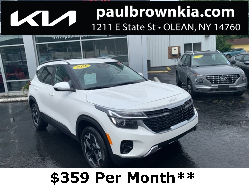 Our For The People Pricing means ZERO price increases at Paul Brown. $1,823 off MSRP! 2026 Kia Seltos S 4D Sport Utility Snow White Pearl 2.0L I4 MPI CVT AWD ** $359 Per month 36 month lease 30,000 total miles at lease end. $2,059 total down including first payment. NYS Tax and fees are included in the payment. Residency restrictions may apply. Must Qualify through KMF. No Security Deposit Required, Air Conditioning, Apple CarPlay & Android Auto, Automatic temperature control, Cloth & Artificial Leather Seat Trim, Emergency communication system: 911 Connect, Exterior Parking Camera Rear, Heated door mirrors, Heated Front Bucket Seats (3-Steps), Navigation System/GPS/Navi, Power door mirrors, Rear window defroster, Wheels: 17" Alloy w/Machined Finish. 27/31 City/Highway MPG Final Price may require vehicle trade in and Paul Brown trade assistance , see website for details. For a hassle free purchase experience, reach out to the Sales team at Paul Brown Chevy at (716) 244-6077. Conveniently located on Route 16 North, Olean NY 14760. We are worth the trip! Travel from over 75 miles away and don't purchase we will supply you with $25 gas card! Paul Brown Chevy, A Dealer For the People! Price includes: $500 - KFA Dealer Choice Program: $500 discount and 5.50% APR for 36 months. $30.20 per $1000 financed. Available to well qualified buyers who finance through Kia Finance America. 506. Exp. 11/03/2025