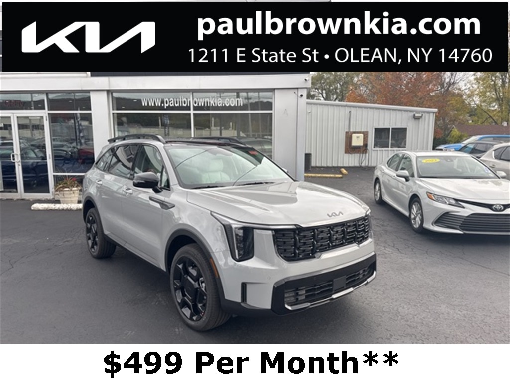 Our For The People Pricing means ZERO price increases at Paul Brown. $4,519 off MSRP! 2026 Kia Sorento EX 4D Sport Utility Wolf Gray 2.5L I4 DGI Turbocharged DOHC 16V LEV3-SULEV30 281hp 8 Speed Dual Clutch AWD **$499 Per month 36 month lease 30,000 total miles at lease end. $3,699 total down including first payment. NYS Tax and fees are included in the payment. Residency restrictions may apply. Must Qualify through KMF. No Security Deposit Required, Apple CarPlay & Android Auto, Emergency communication system: 911 Connect, Exterior Parking Camera Rear, Front dual zone A/C, Heated door mirrors, Heated front seats, Low tire pressure warning, Navigation System/GPS/Navi, Power door mirrors, Power driver seat, Power Liftgate, Rear window defroster, Remote keyless entry, SynTex Artificial Leather Seat Trim, Wheels: 20" Machine-Finished Gloss Black Alloy. 20/27 City/Highway MPG Final Price may require vehicle trade in and Paul Brown trade assistance, see website for details. For a hassle free purchase experience, reach out to the Sales team at Paul Brown Chevy at (716) 244-6077. Conveniently located on Route 16 North, Olean NY 14760. We are worth the trip! Travel from over 75 miles away and don't purchase we will supply you with $25 gas card! Paul Brown Chevy, A Dealer For the People! Price includes: $2500 - KFA Dealer Choice Program: $2500 discount and 5.25% APR for 36 months. $30.08 per $1000 financed. Available to well qualified buyers who finance through Kia Finance America. 506. Exp. 01/02/2026