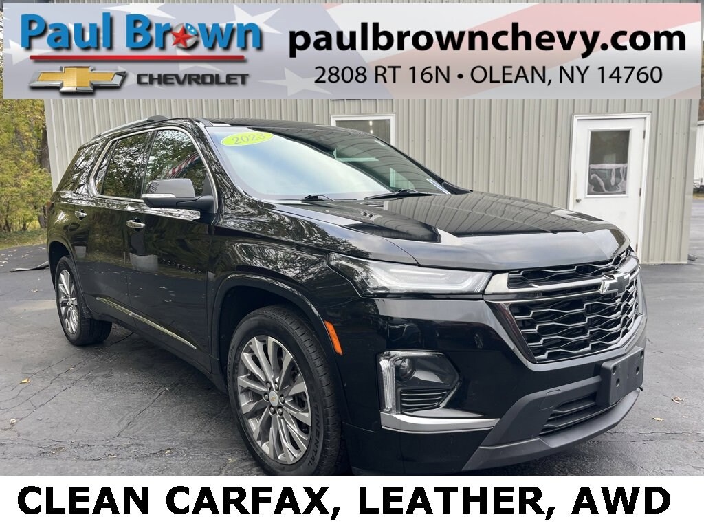 CARFAX One-Owner. Clean CARFAX. 2023 Chevrolet Traverse Premier 4D Sport Utility Mosaic Black Metallic 3.6L V6 SIDI VVT 9-Speed Automatic AWD 6-Way Power Front Passenger Seat, 8-Way Power Driver Seat Adjuster, Apple CarPlay/Android Auto, Bose Premium 10-Speaker Audio System Feature, Dual SkyScape 2-Panel Power Sunroof, Exterior Parking Camera Rear, Front dual zone A/C, Heated 2nd Row Outboard Position Seats, Heated door mirrors, Heated front seats, Heated steering wheel, Low tire pressure warning, Memory seat, Navigation System, Perforated Leather-Appointed Seat Trim, Power door mirrors, Power Liftgate, Rear air conditioning, Rear window defroster, SiriusXM w/360L, Ventilated Driver & Front Passenger Seats. Final Price may require vehicle trade in and Paul Brown trade assistance , see website for details. For a hassle free purchase experience, reach out to the Sales team at Paul Brown Chevy at (716) 244-6077. Conveniently located on Route 16 North, Olean NY 14760. We are worth the trip! Travel from over 75 miles away and don't purchase we will supply you with $25 gas card! Paul Brown Chevy, A Dealer For the People!