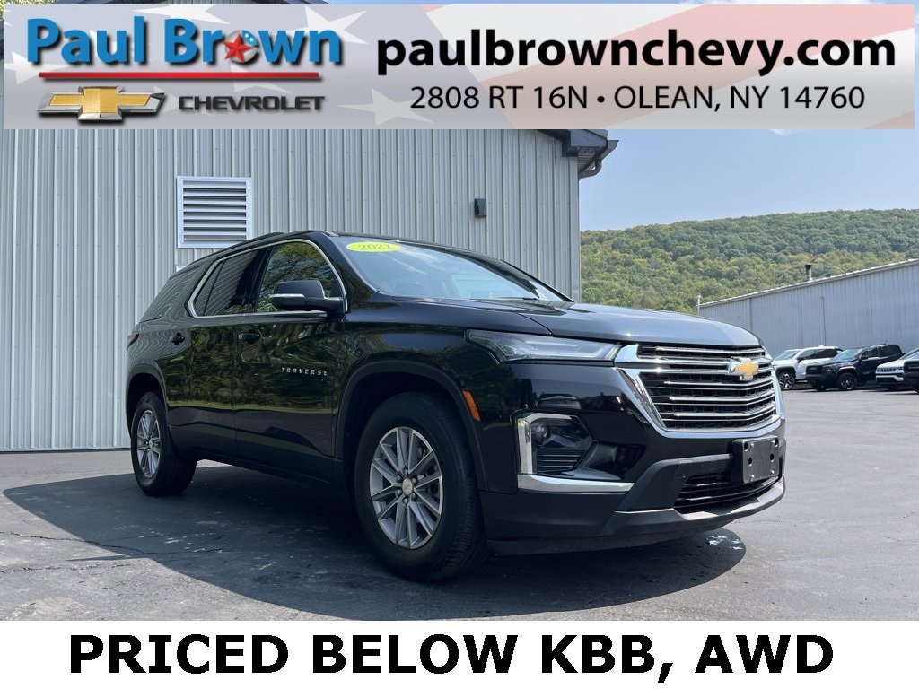 Priced below KBB Fair Purchase Price! CARFAX One-Owner. 2023 Chevrolet Traverse LT 1LT 4D Sport Utility Mosaic Black Metallic 3.6L V6 SIDI VVT 9-Speed Automatic AWD 6-Speaker Audio System Feature, 8-Way Power Driver Seat Adjuster, Apple CarPlay/Android Auto, Exterior Parking Camera Rear, Front dual zone A/C, Fully automatic headlights, Heated door mirrors, Heated front seats, Low tire pressure warning, Power door mirrors, Power Liftgate, Premium Cloth Seat Trim, Radio: Chevrolet Infotainment 3 Plus System, Rear air conditioning, Rear window defroster, Wheels: 18 Bright Silver-Painted Aluminum. Final Price may require vehicle trade in and Paul Brown trade assistance , see website for details. For a hassle free purchase experience, reach out to the Sales team at Paul Brown Chevy at (716) 244-6077. Conveniently located on Route 16 North, Olean NY 14760. We are worth the trip! Travel from over 75 miles away and don't purchase we will supply you with $25 gas card! Paul Brown Chevy, A Dealer For the People!