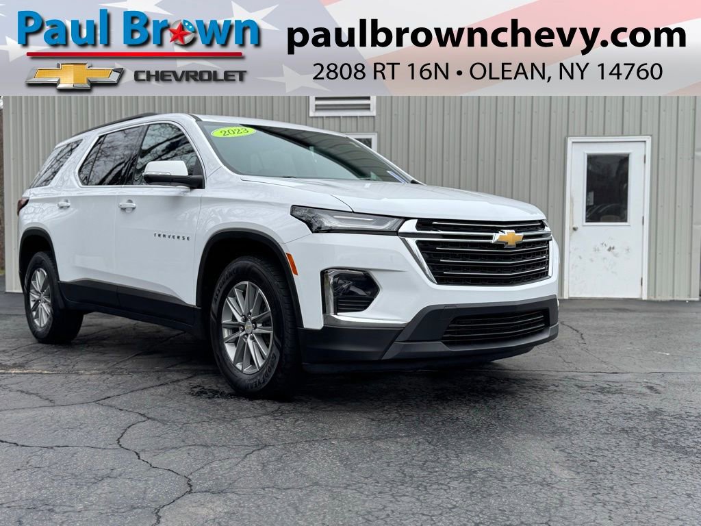 CARFAX One-Owner. Clean CARFAX. 2023 Chevrolet Traverse LT 1LT 4D Sport Utility Summit White 3.6L V6 SIDI VVT 9-Speed Automatic AWD Odometer is 11710 miles below market average! Final Price may require vehicle trade in and Paul Brown trade assistance , see website for details. For a hassle free purchase experience, reach out to the Sales team at Paul Brown Chevy at (716) 244-6077. Conveniently located on Route 16 North, Olean NY 14760. We are worth the trip! Travel from over 75 miles away and don't purchase we will supply you with $25 gas card! Paul Brown Chevy, A Dealer For the People!