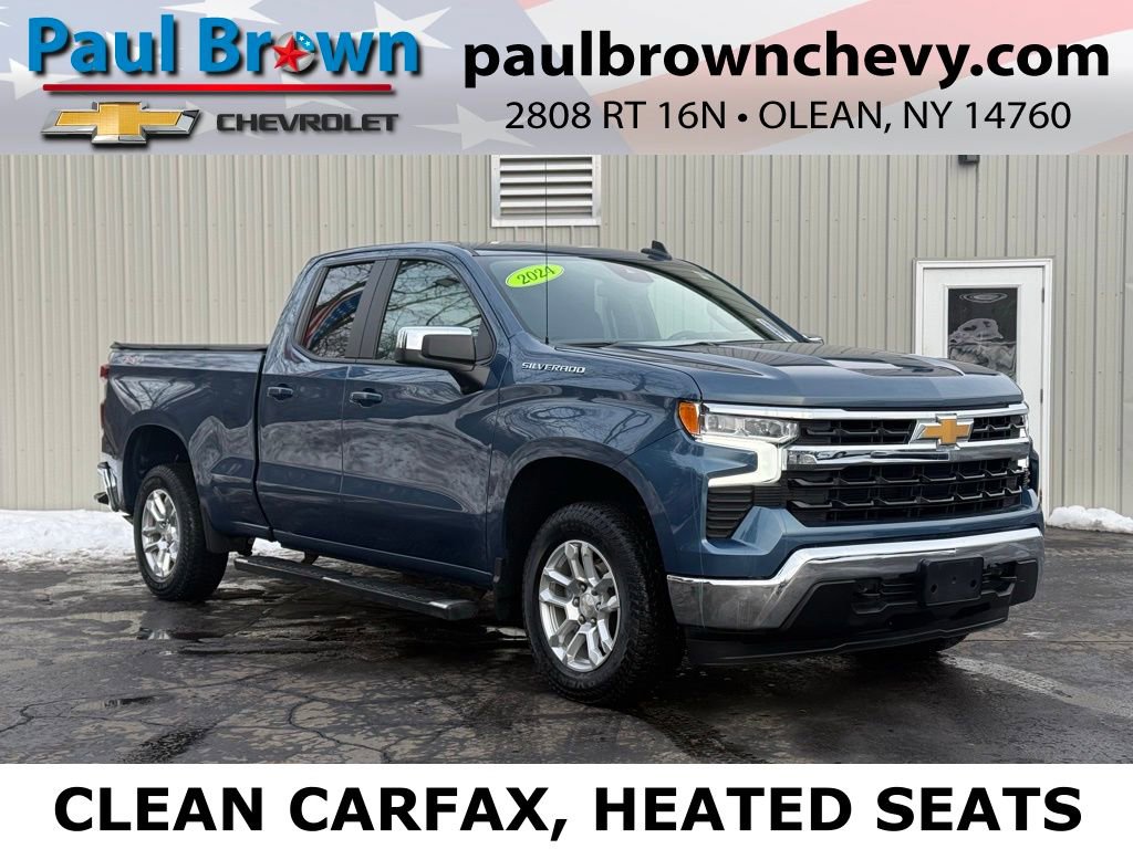 Priced below KBB Fair Purchase Price! CARFAX One-Owner. Clean CARFAX. 2024 Chevrolet Silverado 1500 LT 4D Extended Cab Lakeshore Blue Metallic 2.7L I4 Turbocharged DOHC 16V LEV3-SULEV30 310hp 8-Speed Automatic 4WD 12.3 Multicolor Reconfigurable Digital Display, 120-Volt Bed Mounted Power Outlet, 120-Volt Interior Power Outlet, Auto-Locking Rear Differential, Automatic Emergency Braking, Bluetooth® For Phone, Chevrolet Connected Access Capable, Cloth Seat Trim, Dual Rear USB Ports (Charge Only), Following Distance Indicator, Forward Collision Alert, Front dual zone A/C, Front Pedestrian Braking, Fully automatic headlights, Heated door mirrors, Heated Steering Wheel, Hitch Guidance, Lane Keep Assist w/Lane Departure Warning, Low tire pressure warning, OnStar & Chevrolet Connected Services Capable, Power door mirrors, Rear window defroster, Remote keyless entry, Remote Vehicle Starter System, SiriusXM w/360L, Trailering Package, Wheels: 18 x 8.5 Bright Silver Painted Aluminum, Wi-Fi Hot Spot Capable. Final Price may require vehicle trade in and Paul Brown trade assistance , see website for details. For a hassle free purchase experience, reach out to the Sales team at Paul Brown Chevy at (716) 244-6077. Conveniently located on Route 16 North, Olean NY 14760. We are worth the trip! Travel from over 75 miles away and don't purchase we will supply you with $25 gas card! Paul Brown Chevy, A Dealer For the People!