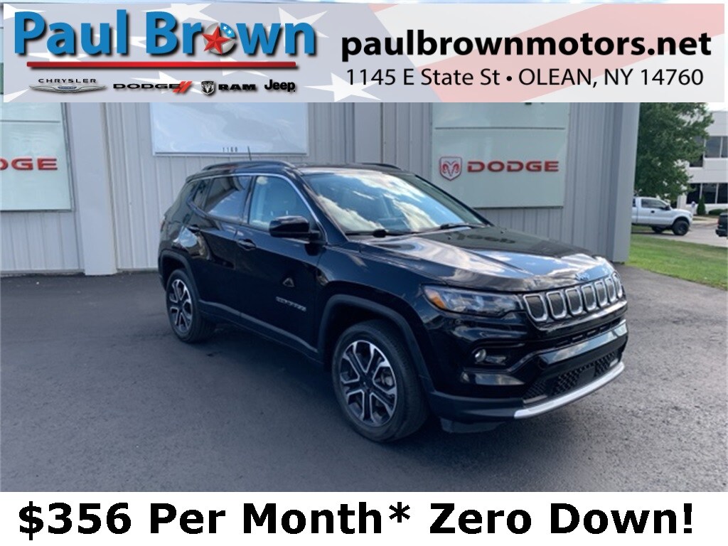 CARFAX One-Owner. 2022 Jeep Compass Limited 4D Sport Utility Diamond Black Crystal Pearlcoat 2.4L I4 4WD 9-Speed 948TE Automatic *$356 per month / Zero cash or trade down / tax not included / 84 months and must qualify for top tier, Emergency communication system: SiriusXM Guardian, Front dual zone A/C, Fully automatic headlights, Heated door mirrors, Heated front seats, Heated steering wheel, Leather Trimmed Bucket Seats, Low tire pressure warning, ParkView Rear Back-Up Camera, Power door mirrors, Power driver seat, Rain sensing wipers, Rear window defroster, Wheels: 18" x 7" Painted Diamond Cut Aluminum. 22/30 City/Highway MPG Final Price may require vehicle trade in and Paul Brown trade assistance , see website for details. For a hassle free purchase experience, reach out to the Sales team at Paul Brown Chevy at (716) 244-6077. Conveniently located on Route 16 North, Olean NY 14760. We are worth the trip! Travel from over 75 miles away and don't purchase we will supply you with $25 gas card! Paul Brown Chevy, A Dealer For the People! Our For The People Pricing means ZERO price increases at Paul Brown.