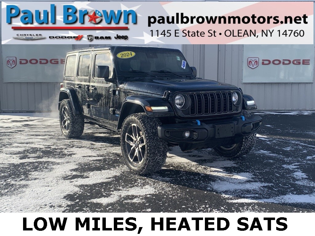 2024 Jeep Wrangler Sport S 4xe 4D Sport Utility Black Clearcoat 2.0L I4 DOHC 4WD 8-Speed Automatic Balance of new car warranty., 2-Door Passive Entry, Front Door Locks, Apple CarPlay/Android Auto, Black 3-Piece Hard Top, Convenience Group, Emergency/Assistance Call, Front dual zone A/C, Front fog lights, Heated door mirrors, Heated Front Seats, Heated Steering Wheel, Integrated roll-over protection, Low tire pressure warning, ParkView Rear Back-Up Camera, Power door mirrors, Power windows, Quick Order Package 29U Sport S, Rear Window Defroster, Rear Window Wiper/Washer, Remote keyless entry, Remote Start System, Speed control, Universal Garage Door Opener, Wheels: 20" x 8" Machined/Painted Gray. Final Price may require vehicle trade in and Paul Brown trade assistance, see website for details. For a hassle free purchase experience, reach out to the Sales team at Paul Brown Chevy at (716) 244-6077. Conveniently located on Route 16 North, Olean NY 14760. We are worth the trip! Travel from over 75 miles away and don't purchase we will supply you with $25 gas card! Paul Brown Chevy, A Dealer For the People! Our For The People Pricing means ZERO price increases at Paul Brown.