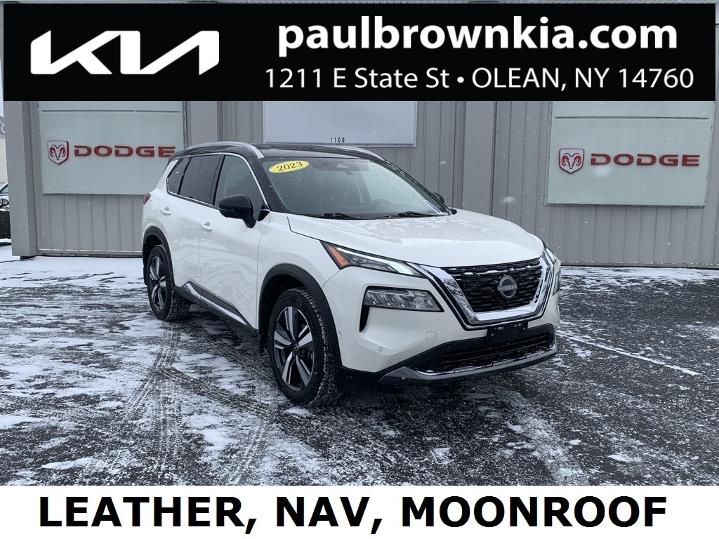 2023 Nissan Rogue SL 4D Sport Utility Pearl White Tricoat/Super Black Odometer is 2629 miles below market average! 1.5L I3 Turbocharged DOHC 12V LEV3-ULEV50 201hp AWD CVT with Xtronic Balance of new car warranty., 19" Aluminum Alloy Wheels, Auto High-beam Headlights, Emergency communication system: NissanConnect Services, Front dual zone A/C, Front, Side & Rear Sonar, Heated door mirrors, Heated front seats, Heated steering wheel, Leather-Appointed Seat Trim, Low tire pressure warning, Memory seat, Motion Activated Power Liftgate, NissanConnect featuring Apple CarPlay and Android Auto, Power door mirrors, Power driver seat, Power Liftgate, Power moonroof, Power passenger seat, Power windows, ProPILOT Assist w/Navi-link, Radio: AM/FM NissanConnect w/Navigation, Rear Door Sunshades, Rear Parking Sensors, Remote keyless entry, SL Premium Package, Speed control, Traffic Sign Recognition, Tri-Zone HVAC. 28/34 City/Highway MPG Final Price may require vehicle trade in and Paul Brown trade assistance, see website for details. For a hassle free purchase experience, reach out to the Sales team at Paul Brown Chevy at (716) 244-6077. Conveniently located on Route 16 North, Olean NY 14760. We are worth the trip! Travel from over 75 miles away and don't purchase we will supply you with $25 gas card! Paul Brown Chevy, A Dealer For the People! Our For The People Pricing means ZERO price increases at Paul Brown.