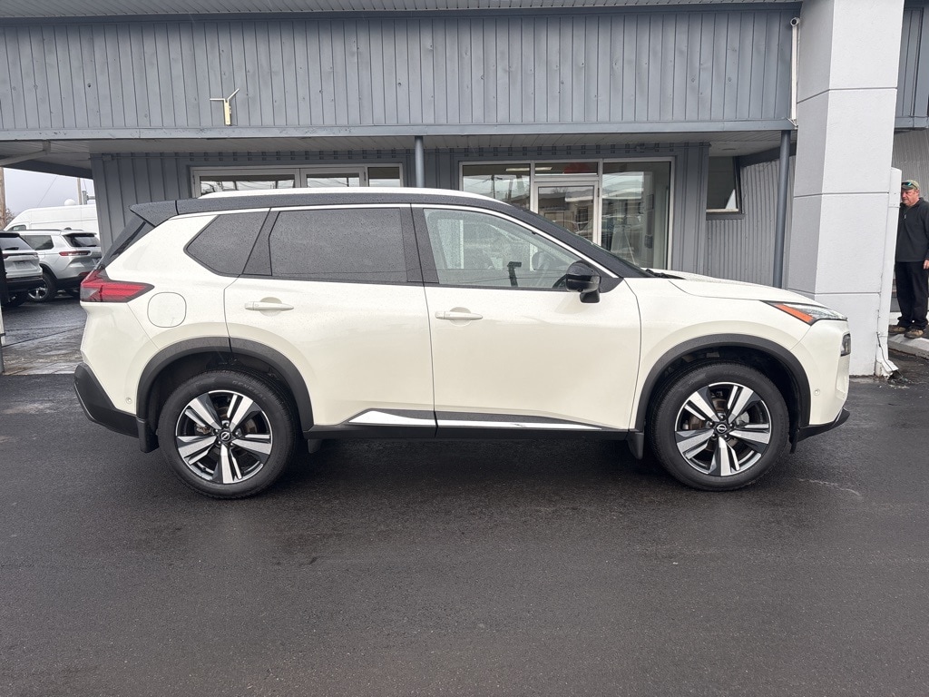 2023 Nissan Rogue SL 4D Sport Utility Pearl White Tricoat/Super Black Odometer is 1468 miles below market average! 1.5L I3 Turbocharged DOHC 12V LEV3-ULEV50 201hp AWD CVT with Xtronic Balance of new car warranty., Alloy wheels, Auto High-beam Headlights, Front dual zone A/C, Front, Side & Rear Sonar, Heated steering wheel, Leather-Appointed Seat Trim, Memory seat, Motion Activated Power Liftgate, NissanConnect featuring Apple CarPlay and Android Auto, Power driver seat, Power Liftgate, Power moonroof, Power passenger seat, Power windows, ProPILOT Assist w/Navi-link, Radio: AM/FM NissanConnect w/Navigation, Rear Door Sunshades, Remote keyless entry, SL Premium Package, Speed control, Traffic Sign Recognition, Tri-Zone HVAC. 28/34 City/Highway MPG Final Price may require vehicle trade in and Paul Brown trade assistance, see website for details. For a hassle free purchase experience, reach out to the Sales team at Paul Brown Chevy at (716) 244-6077. Conveniently located on Route 16 North, Olean NY 14760. We are worth the trip! Travel from over 75 miles away and don't purchase we will supply you with $25 gas card! Paul Brown Chevy, A Dealer For the People! Our For The People Pricing means ZERO price increases at Paul Brown.