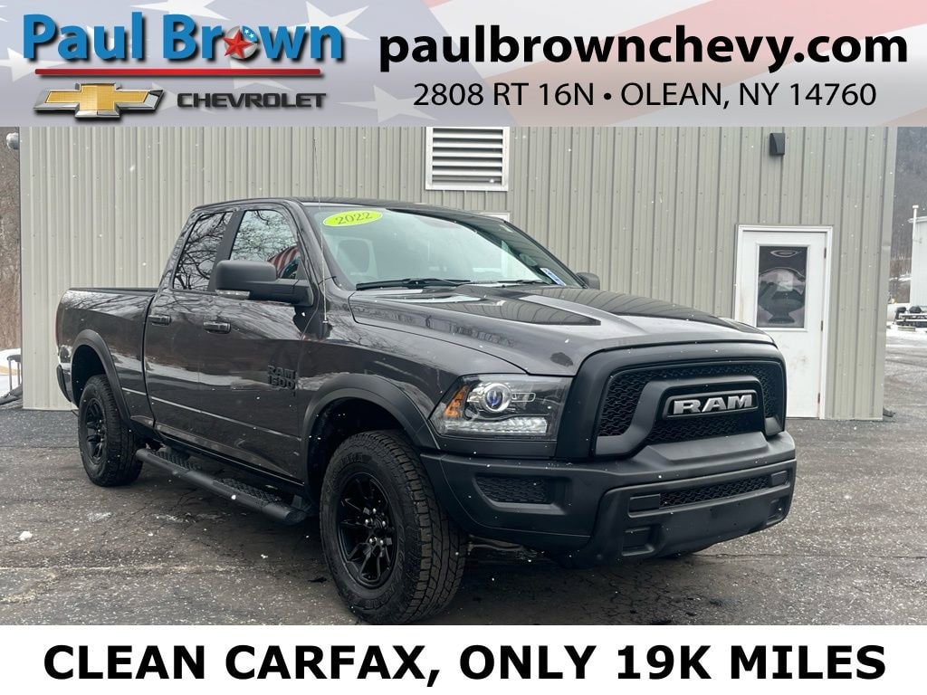 Priced below KBB Fair Purchase Price! CARFAX One-Owner. Clean CARFAX. 2022 Ram 1500 Classic Warlock 4D Quad Cab Granite Crystal Metallic Clearcoat 3.6L V6 24V VVT 8-Speed Automatic 4WD Odometer is 10913 miles below market average! 4G LTE Wi-Fi Hot Spot, Air Conditioning ATC w/Dual Zone Control, Auto-Dimming Exterior Mirrors, Auto-Dimming Rear-View Mirror, Black Exterior Mirrors, Center Hub, Class IV Receiver Hitch, Cloth 40/20/40 Bench Seat, Cluster 7.0 TFT Color Display, Exterior Mirrors Courtesy Lamps, Exterior Mirrors w/Heating Element, Exterior Mirrors w/Supplemental Signals, Glove Box Lamp, Heated door mirrors, Leather Wrapped Steering Wheel, LED Bed Lighting, Low tire pressure warning, Luxury Group, MOPAR Front & Rear Rubber Floor Mats, Overhead Console w/Garage Door Opener, ParkSense Rear Park Assist System, ParkView Rear Back-Up Camera, Power door mirrors, Power Heated Fold-Away Mirrors, Power-Folding Mirrors, Rear Dome w/On/Off Switch Lamp, Steering Wheel Mounted Audio Controls, Sun Visors w/Illuminated Vanity Mirrors, Universal Garage Door Opener, Warlock All Terrain Package, Wheels: 17 x 8 Matte Black Aluminum. Final Price may require vehicle trade in and Paul Brown trade assistance , see website for details. For a hassle free purchase experience, reach out to the Sales team at Paul Brown Chevy at (716) 244-6077. Conveniently located on Route 16 North, Olean NY 14760. We are worth the trip! Travel from over 75 miles away and don't purchase we will supply you with $25 gas card! Paul Brown Chevy, A Dealer For the People!