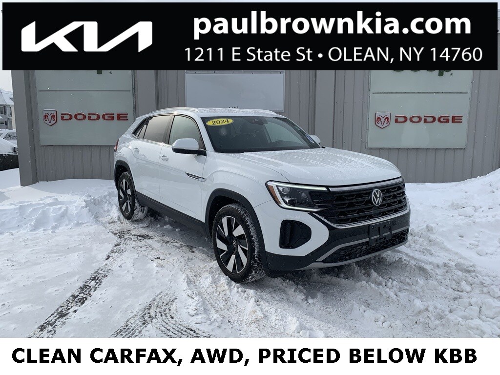Priced below KBB Fair Purchase Price! Clean CARFAX. 2024 Volkswagen Atlas Cross Sport 2.0T SE w/Technology 4D Sport Utility Pure White 2.0L TSI AWD 8-Speed Automatic with Tiptronic Emergency communication system: VW Car-Net Safe & Secure 5-year, Exterior Parking Camera Rear, Front dual zone A/C, Front fog lights, Heated & Actively Ventilated Front Seats, Heated door mirrors, Heated steering wheel, Low tire pressure warning, Perforated V-Tex Leatherette Seating Surfaces, Power door mirrors, Power driver seat, Power Liftgate, Power windows, Rain sensing wipers, Rear window defroster, Remote keyless entry, Speed control, Wheels: 20" 5-Spoke 2-Tone Machined Alloy. 19/26 City/Highway MPG Final Price may require vehicle trade in and Paul Brown trade assistance, see website for details. For a hassle free purchase experience, reach out to the Sales team at Paul Brown Motors at (585-376-5057). Conveniently located on E State Street, Olean NY 14760. We are worth the trip! Travel from over 75 miles away and don't purchase we will supply you with $25 gas card! Paul Brown Chevy, A Dealer For the People! Our For The People Pricing means ZERO price increases at Paul Brown.