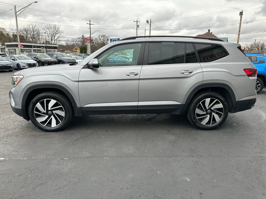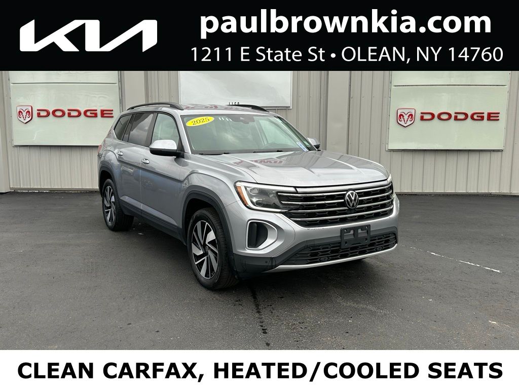 CARFAX One-Owner. Clean CARFAX. 2025 Volkswagen Atlas 2.0T SE w/Technology 4D Sport Utility Silver Mist Metallic 2.0L TSI AWD 8-Speed Automatic Balance of new car warranty., 20" 2-tone machined alloy wheels, 3rd row seats: split-bench, Automatic temperature control, Emergency communication system: VW Car-Net Safe & Secure 5-year, Exterior Parking Camera Rear, Front dual zone A/C, Front fog lights, heated and Actively ventilated front bucket seats, Heated door mirrors, Low tire pressure warning, perforated V-Tex leatherette seating surfaces, Power door mirrors, Power driver seat, Power Liftgate, Power windows, Rain sensing wipers, Rear air conditioning, Remote keyless entry, Speed control, Telescoping steering wheel, Tilt steering wheel. 19/26 City/Highway MPG Final Price may require vehicle trade in and Paul Brown trade assistance, see website for details. For a hassle free purchase experience, reach out to the Sales team at Paul Brown Motors at (585-376-5057). Conveniently located on E State Street, Olean NY 14760. We are worth the trip! Travel from over 75 miles away and don't purchase we will supply you with $25 gas card! Paul Brown Chevy, A Dealer For the People! Our For The People Pricing means ZERO price increases at Paul Brown.